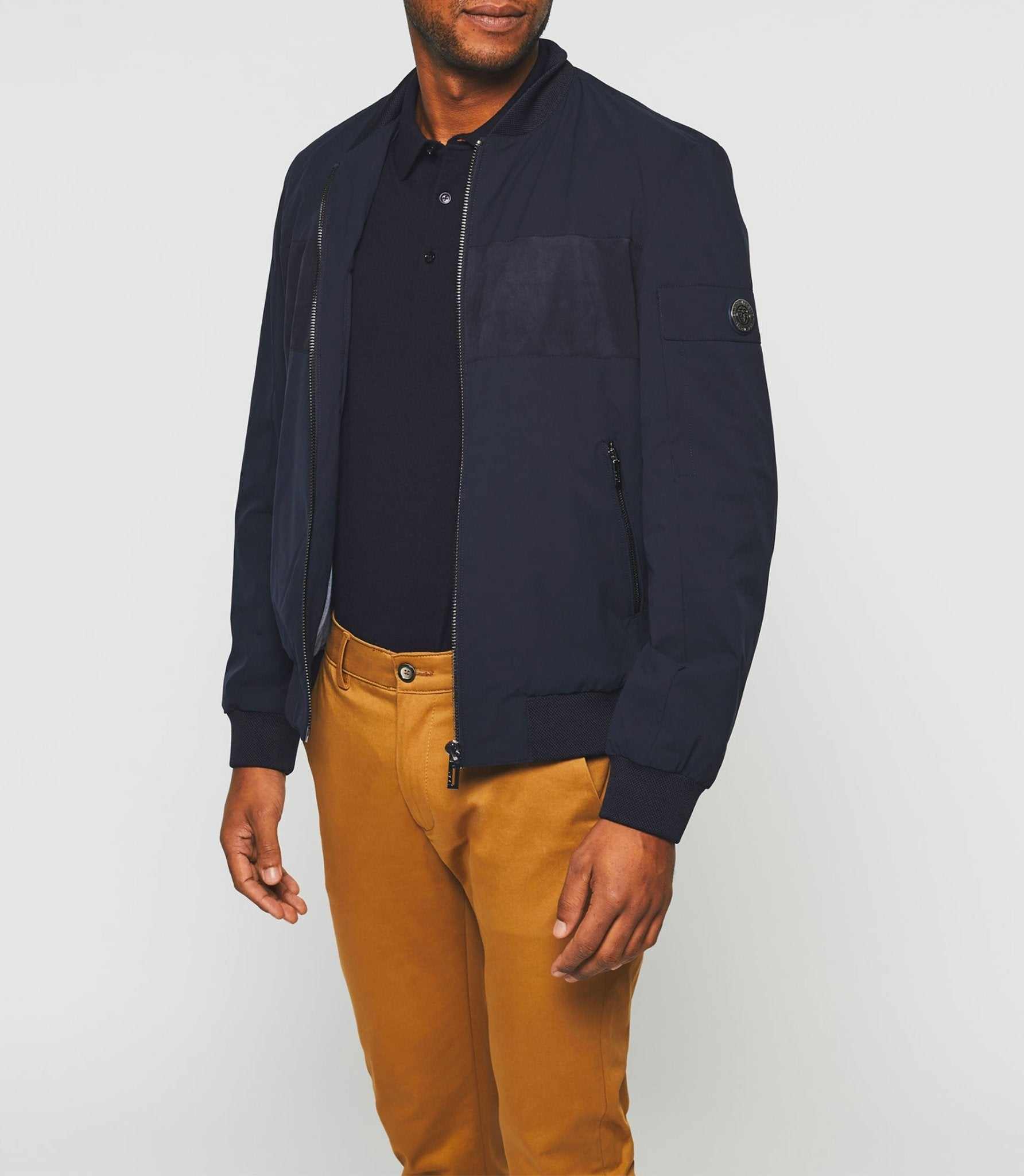 Effet bi-matière avec un empiècement en suède sur le devant.
