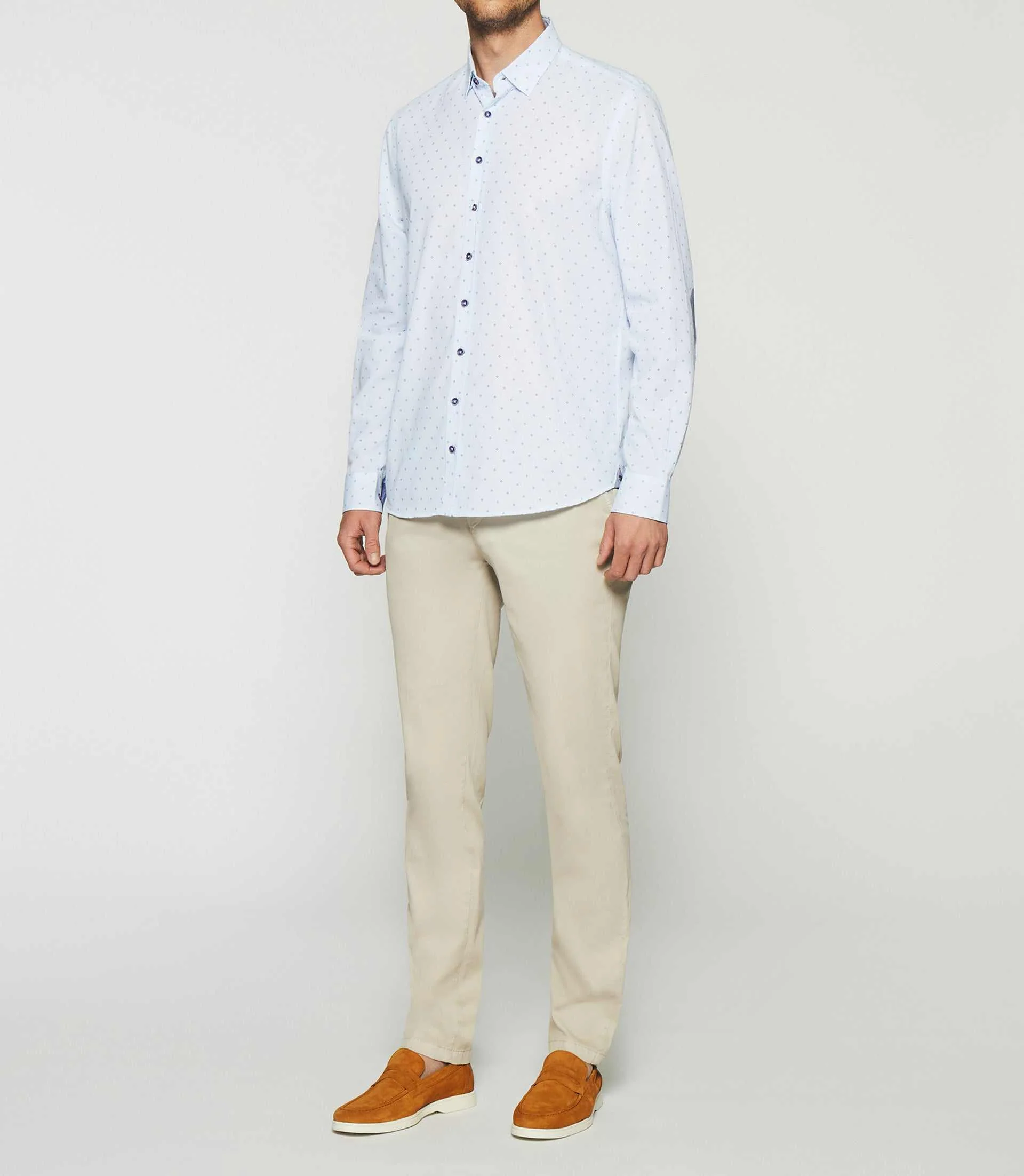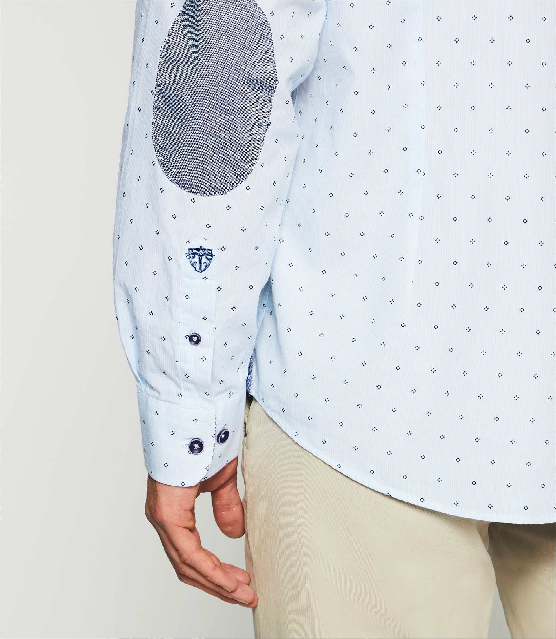 Cette chemise est à manches longues avec un col à boutons et une coupe droite. Les coudières sont imprimées pour donner une touche originale à la chemise. Elle est fabriquée en coton de qualité pour un port agréable. La chemise peut être portée avec un pantalon habillé pour une tenue formelle ou avec un jean pour un look plus décontracté.