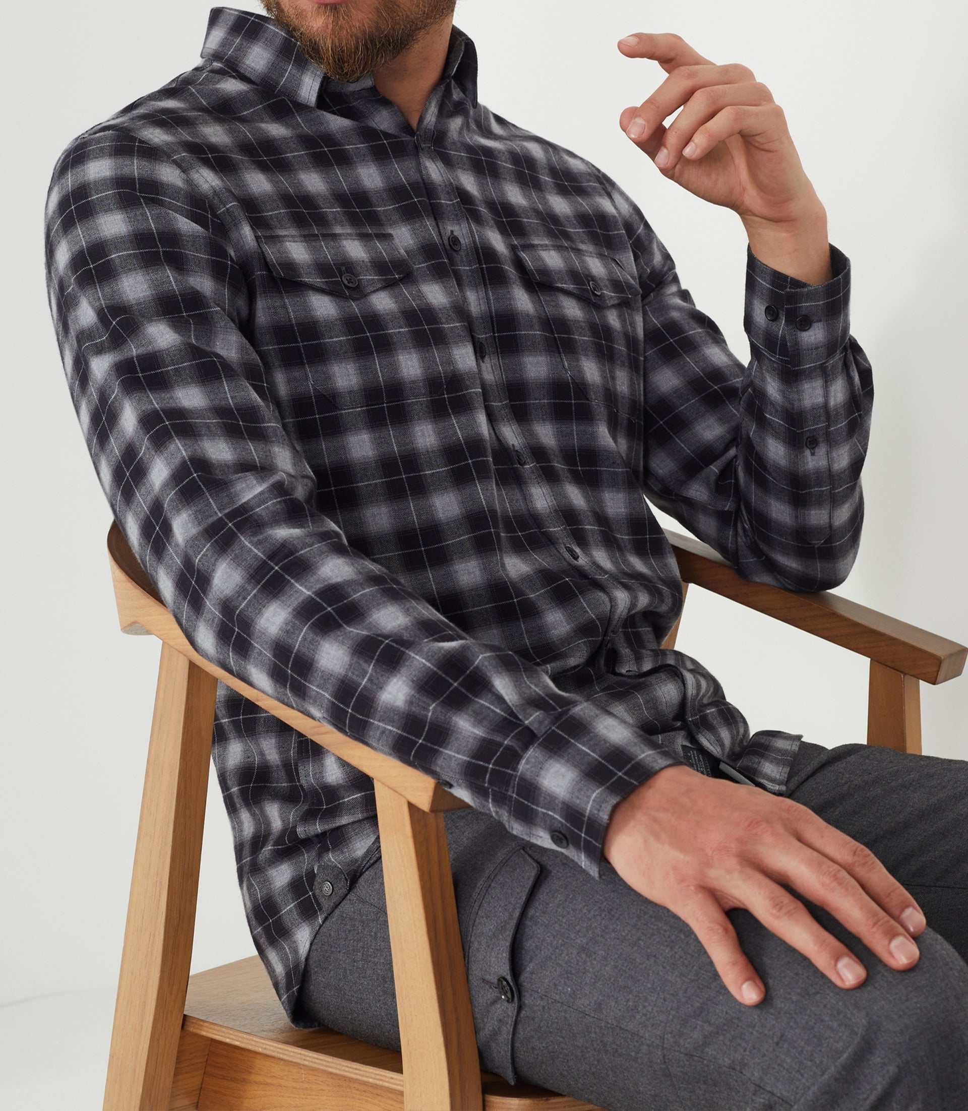Contraste en flanelle anthracite à l’intérieur poignet, pied de col, empiècement dos et détail avec rivet sur le bas de chaque couture côté.