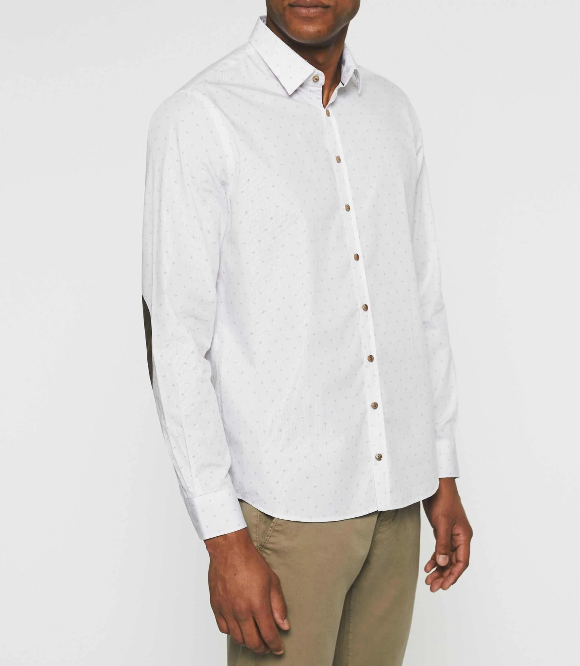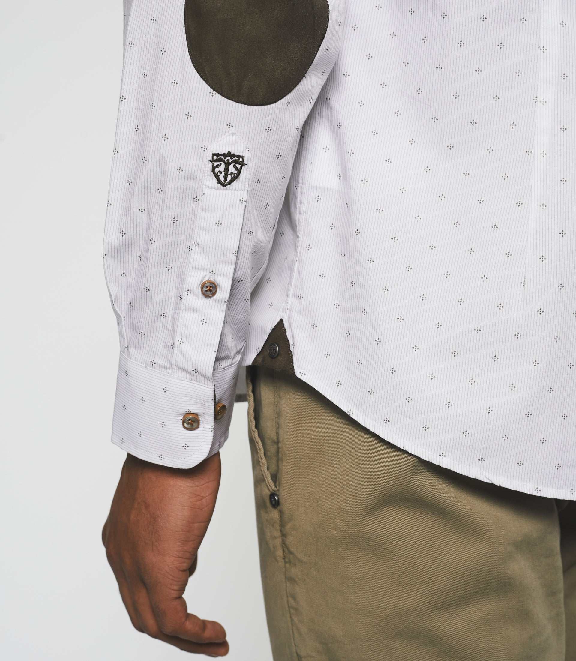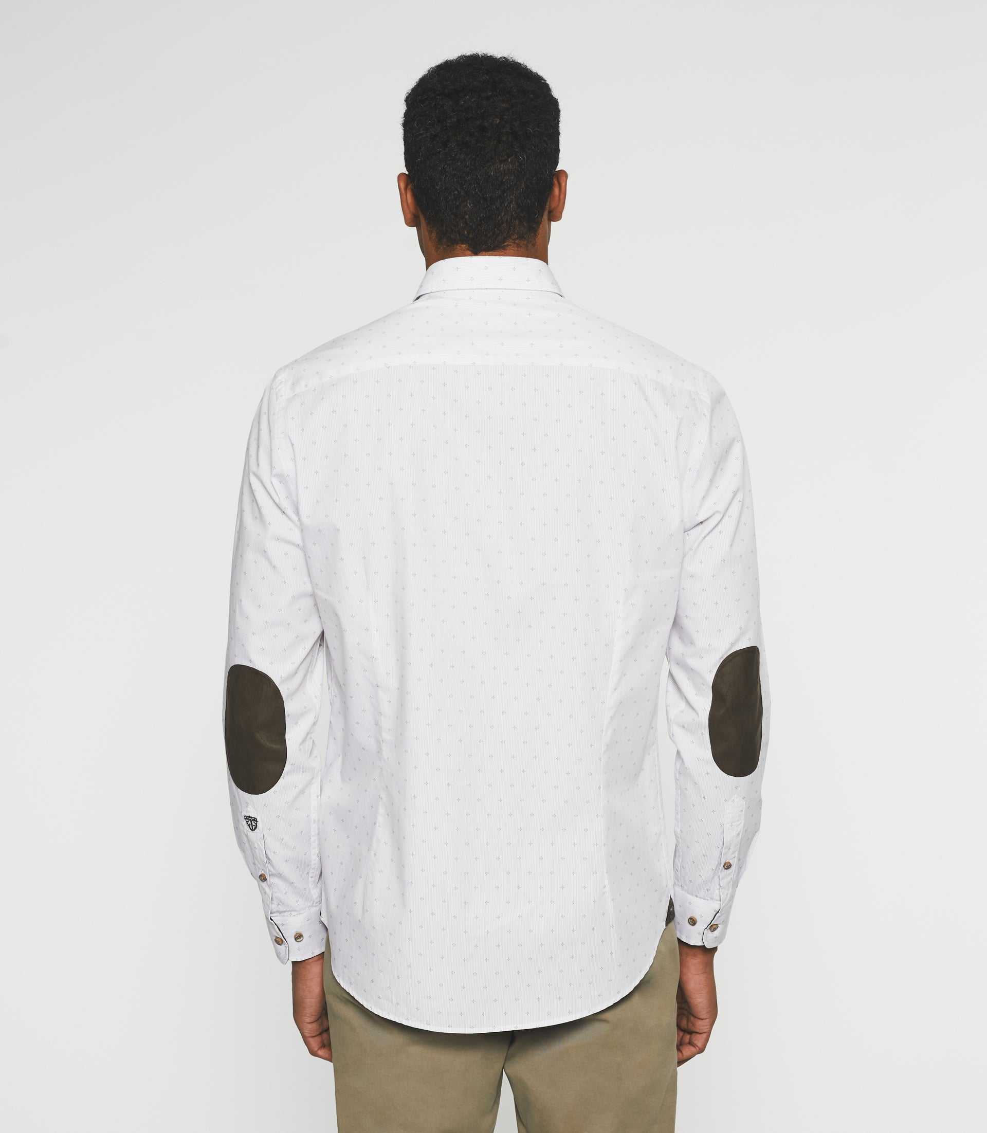 – tissu en suédine au niveau des coudières, du biais à l’intérieur du col, du biais à la patte de boutonnage intérieure, à l’intérieur des poignets et l’hirondelle