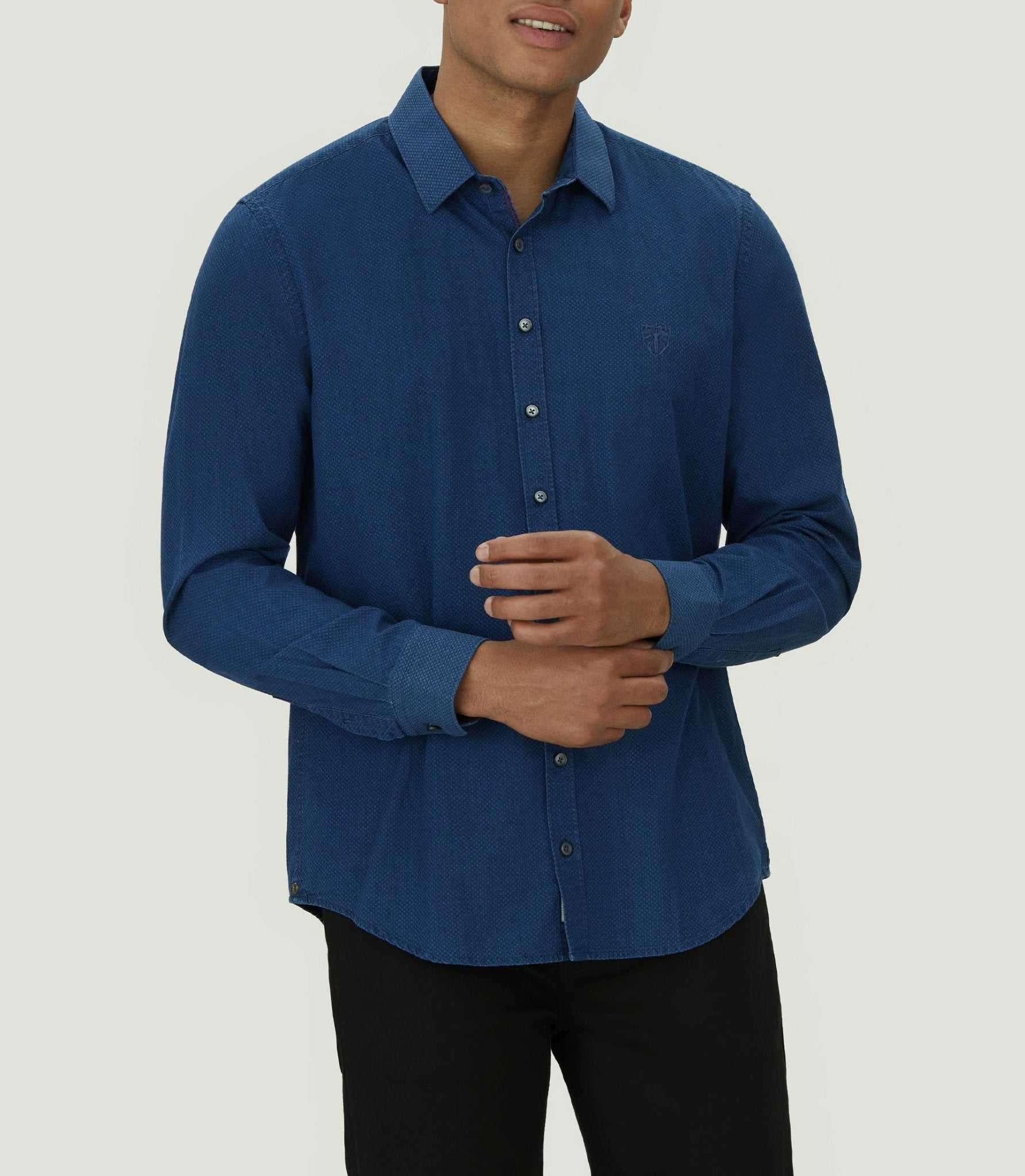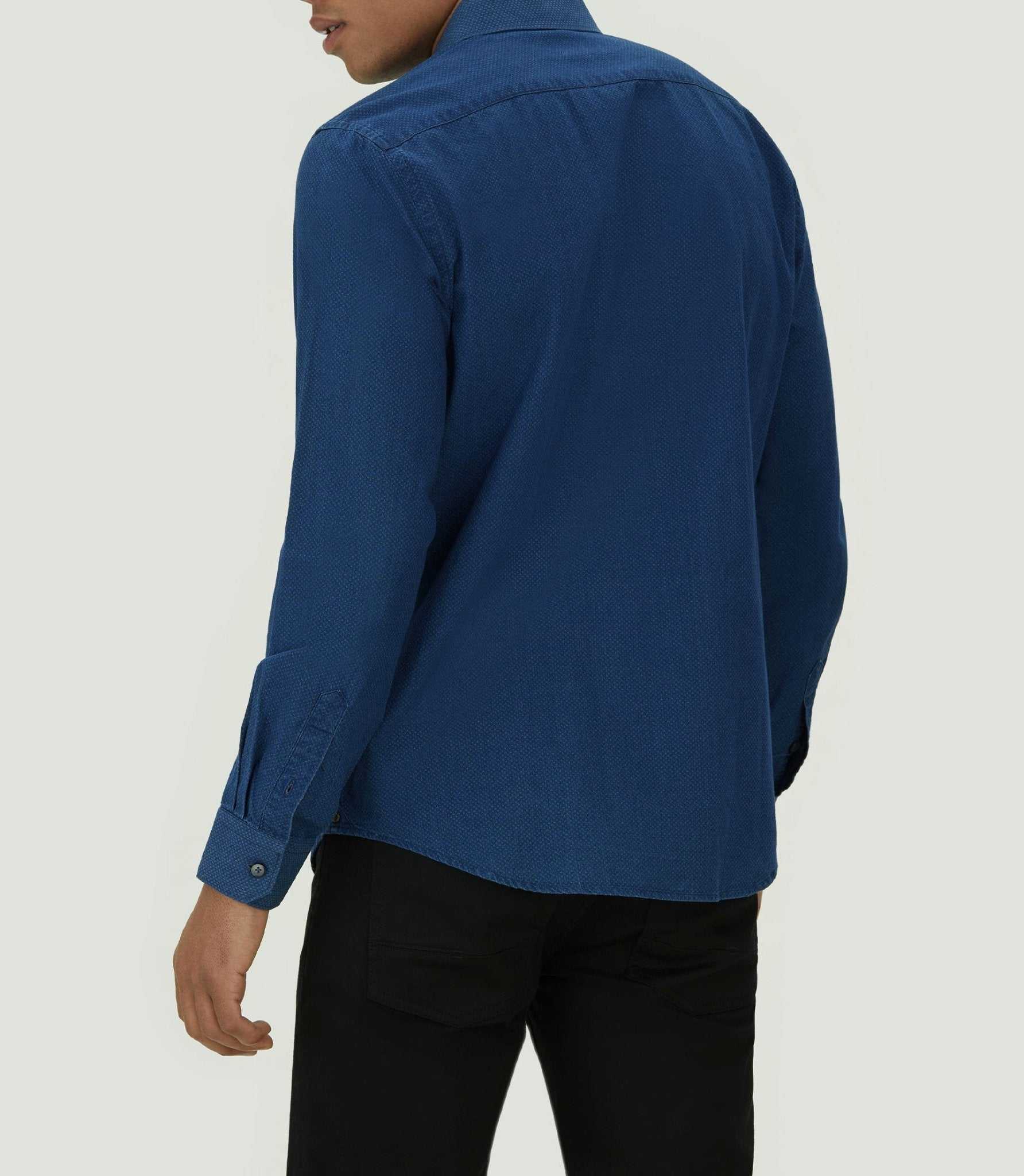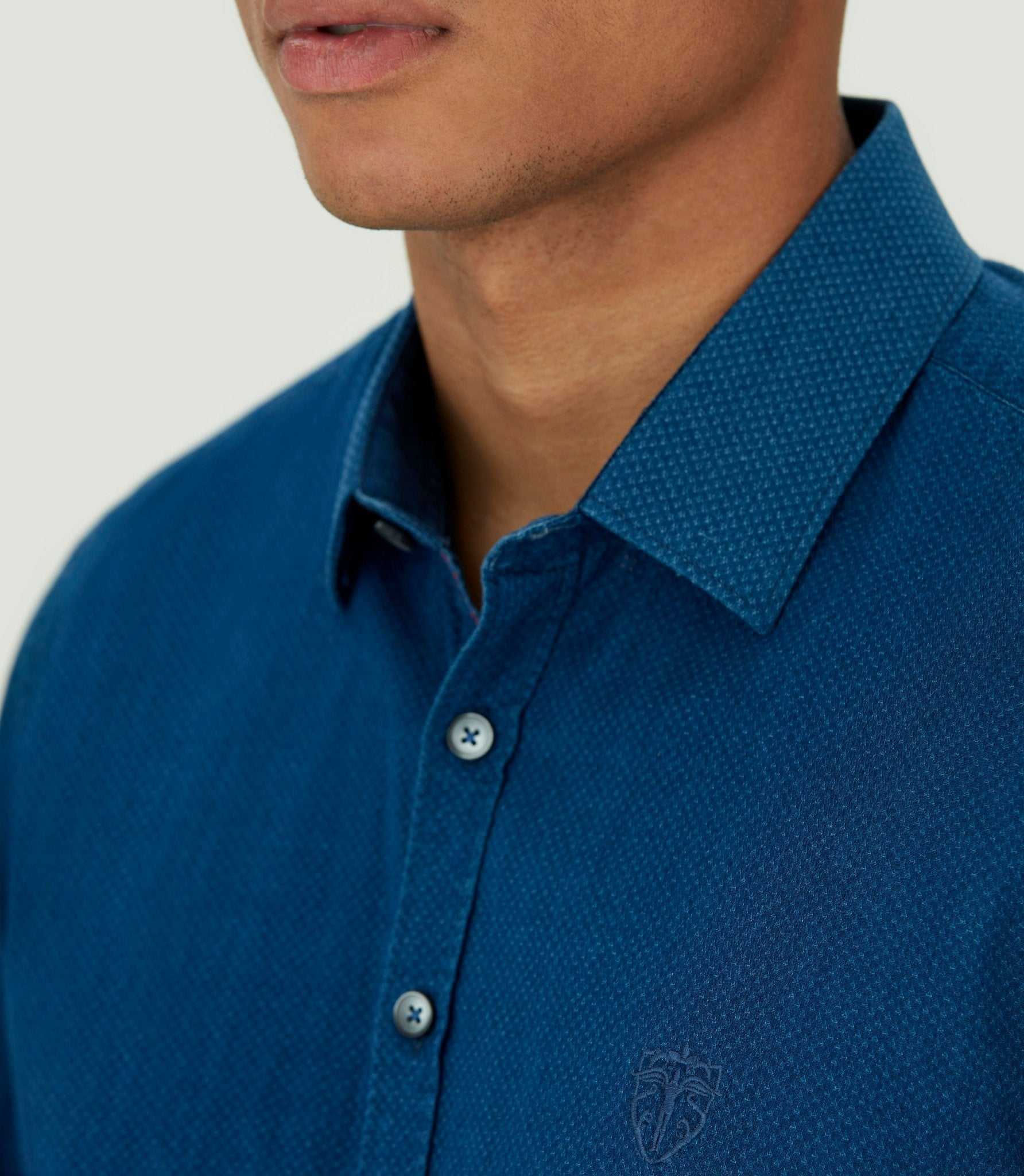 Contraste popeline marine au pied de col, intérieur poignet détails et triangle avec rivet en bas de chaque couture côté.