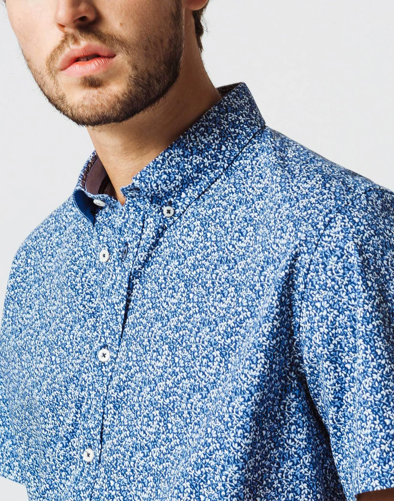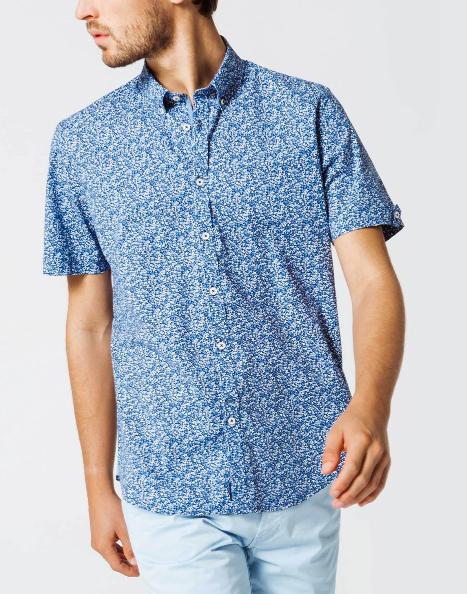 Chemise en coton bleu marine à micro motif fleurs.