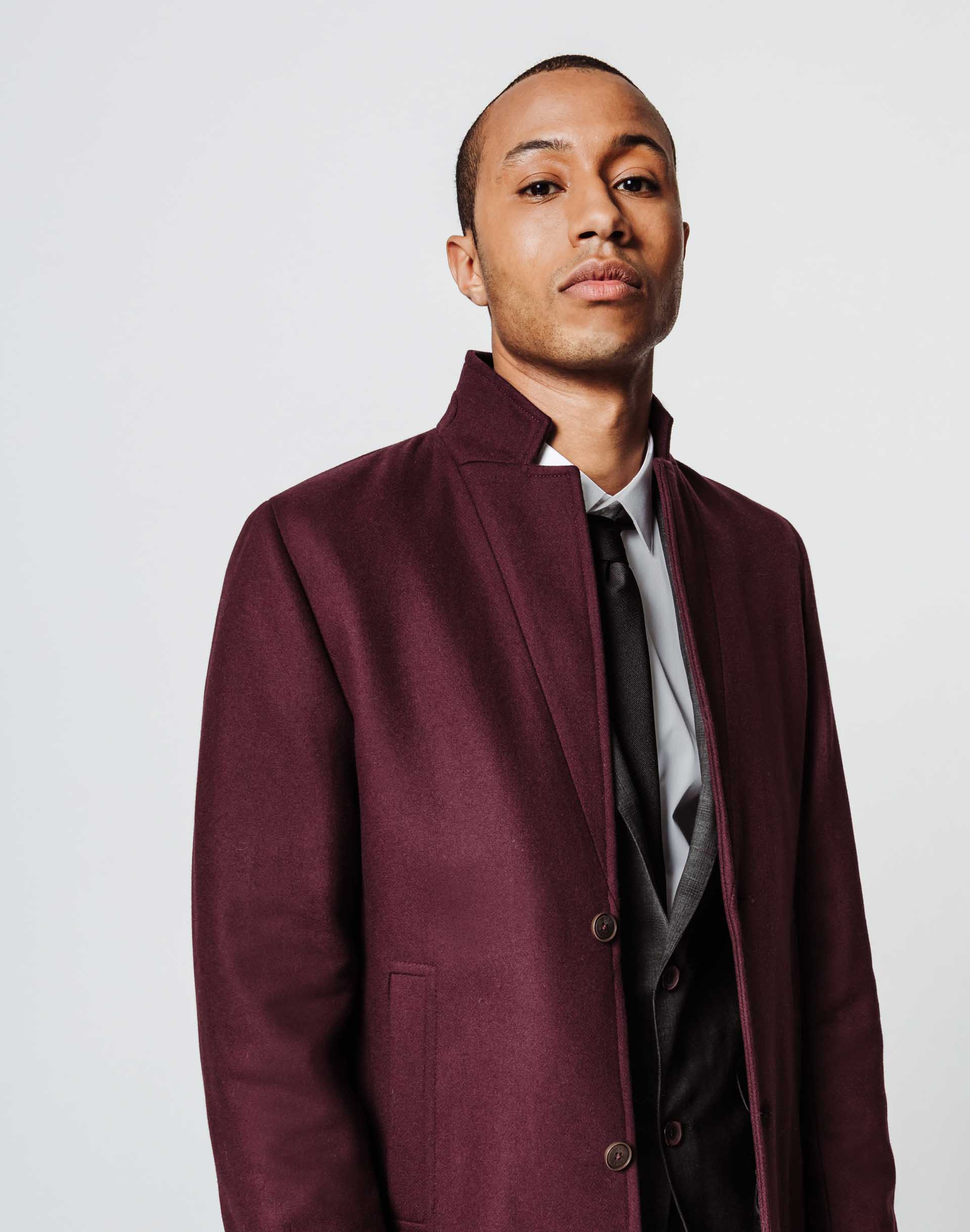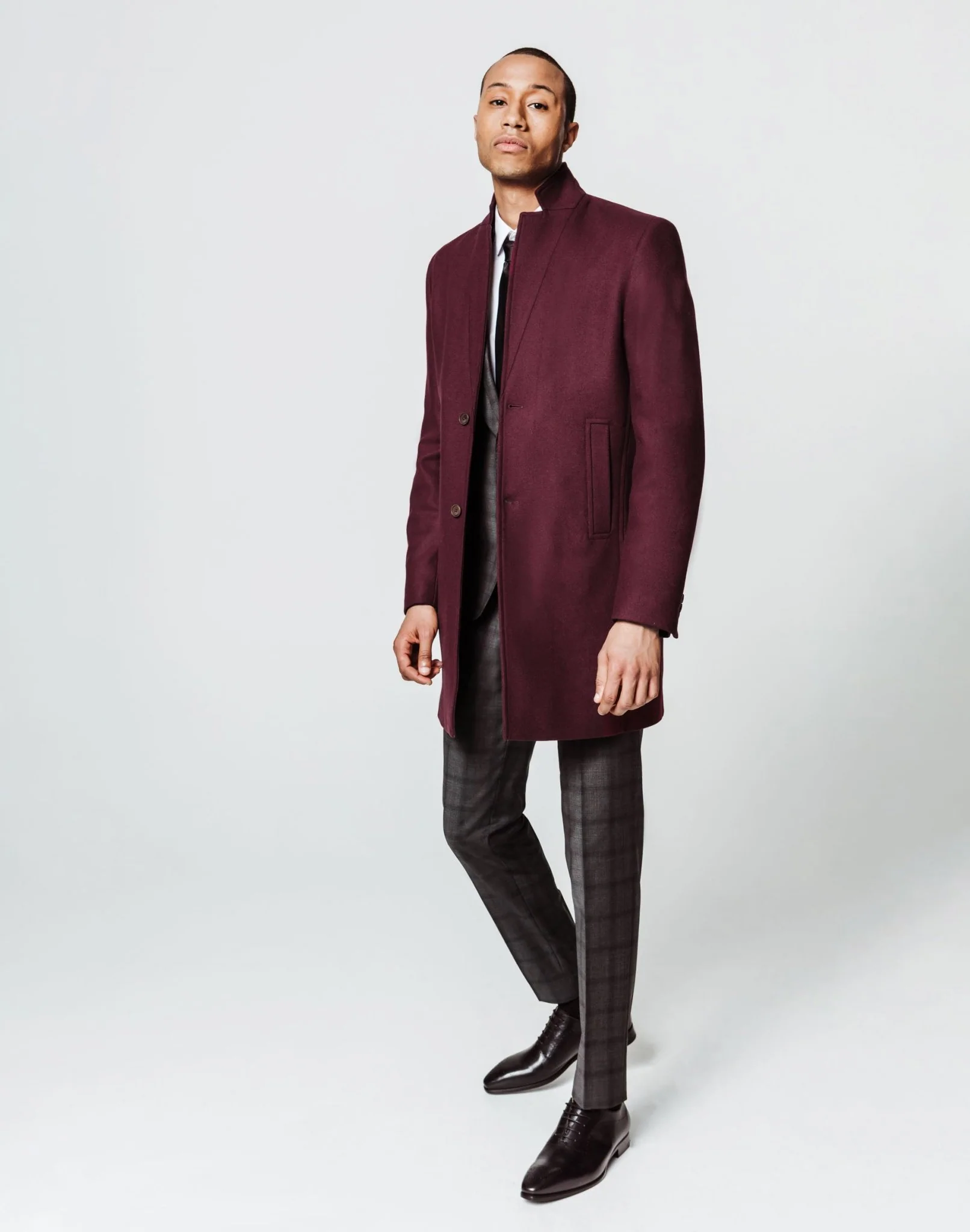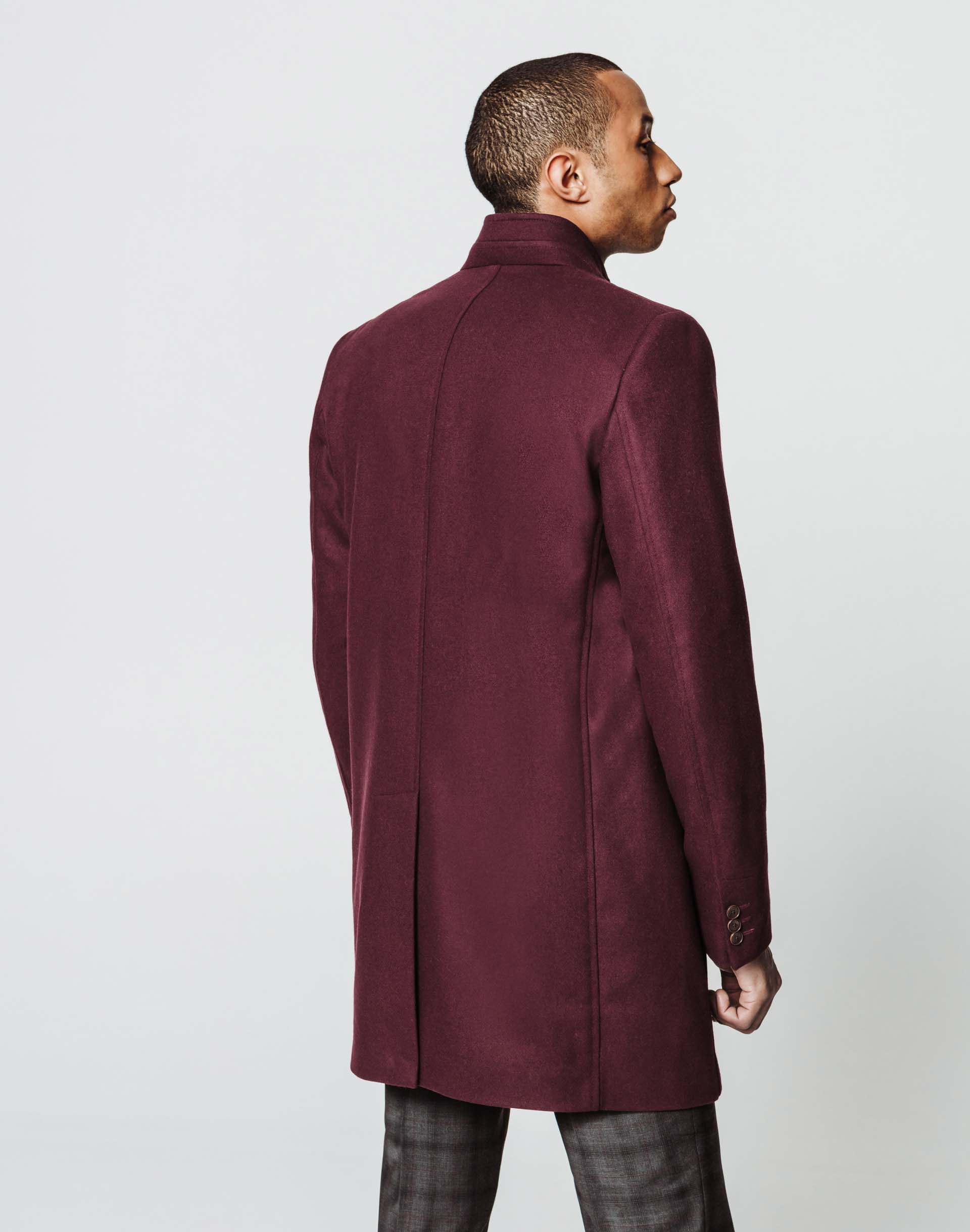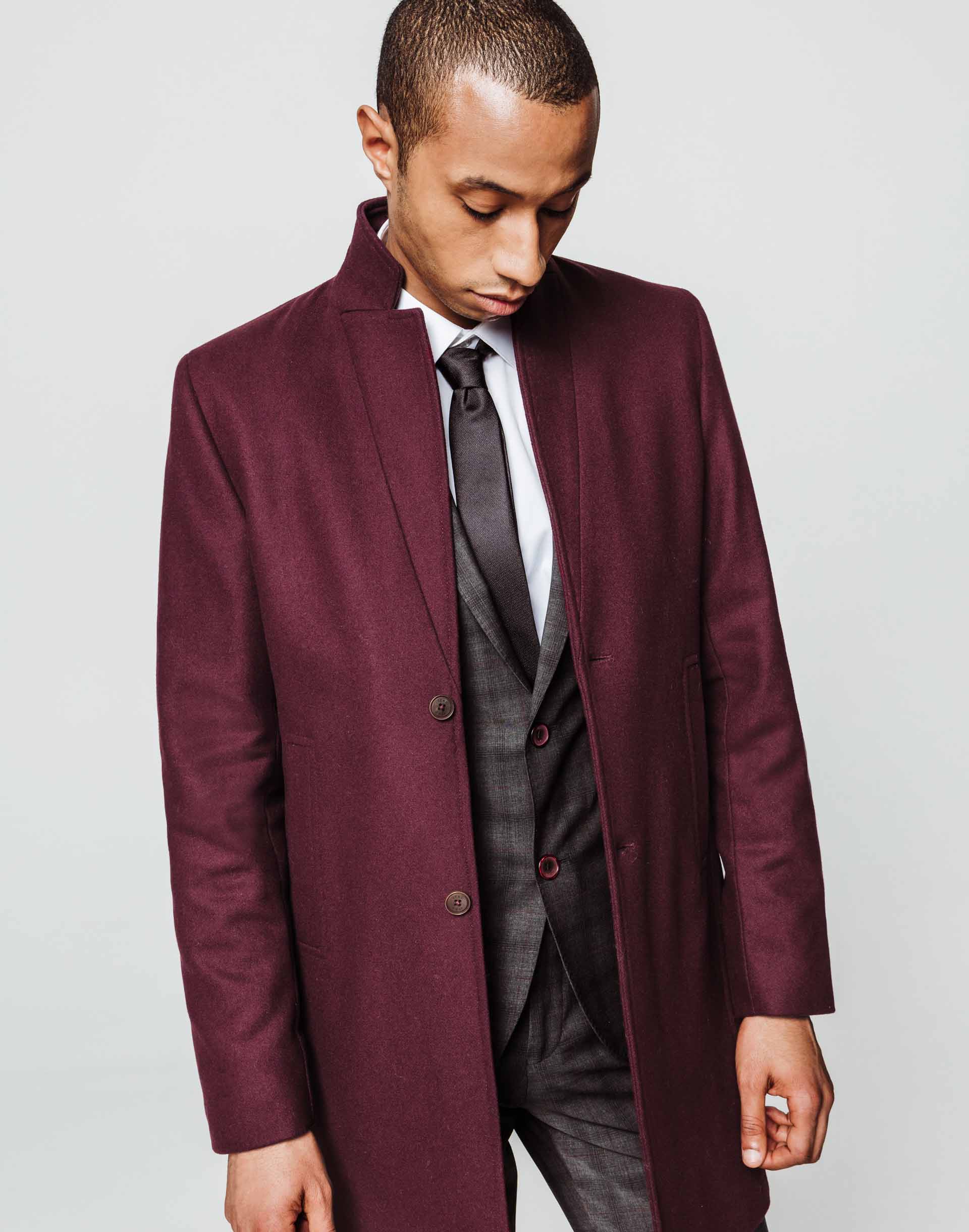 Manteau long en laine mélangée bordeaux.