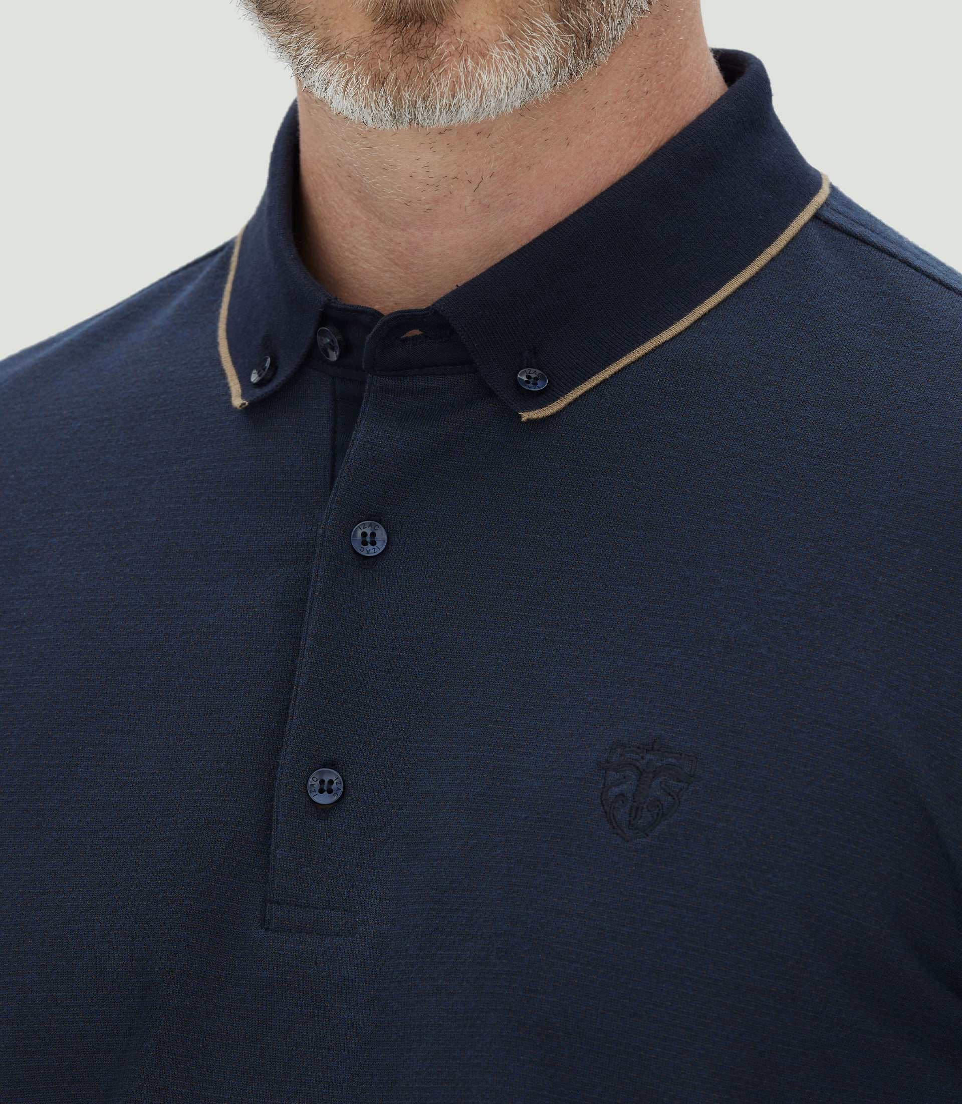 Contraste en gabardine demi-lune, pied de col et patte de boutonnage.