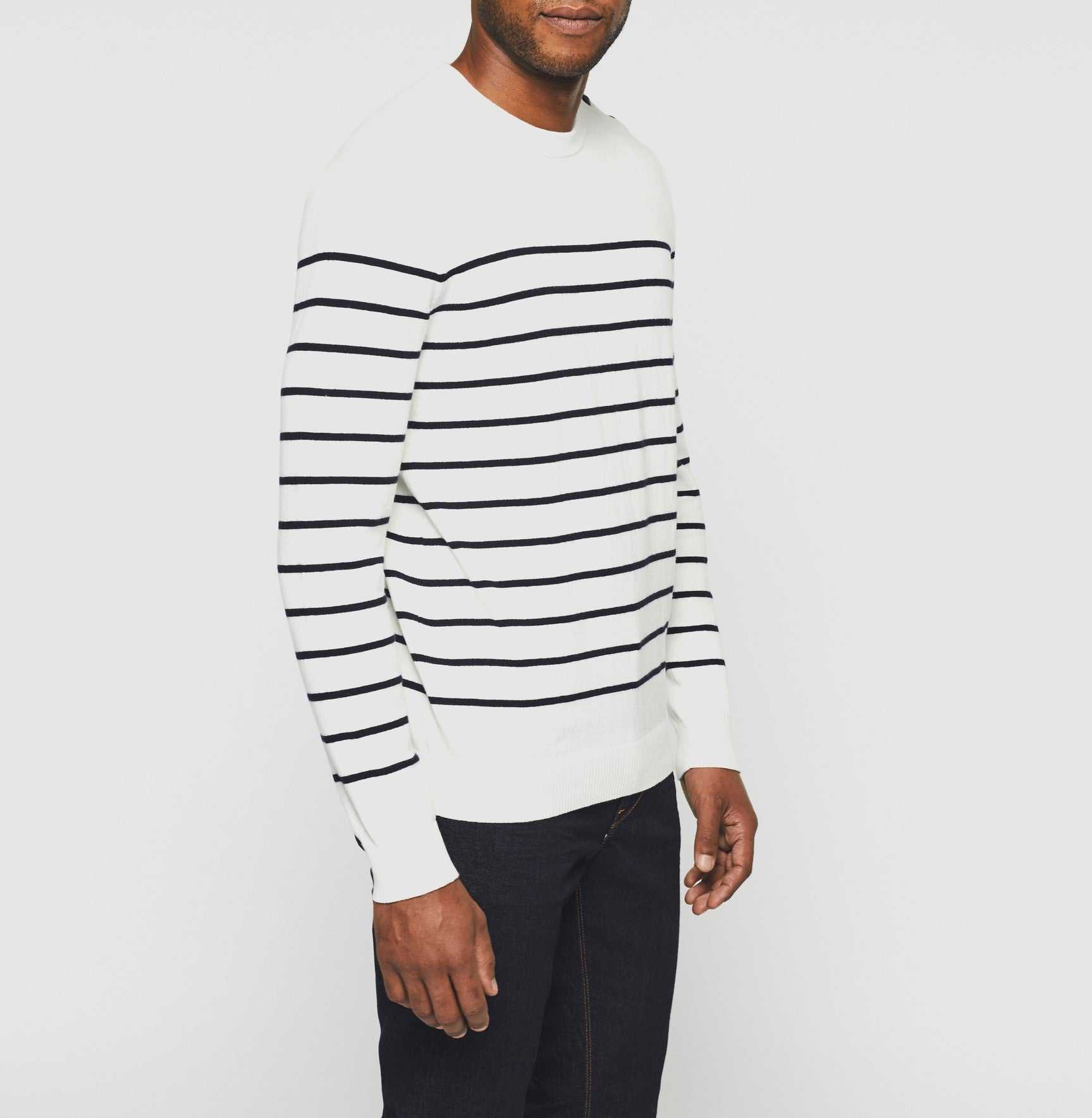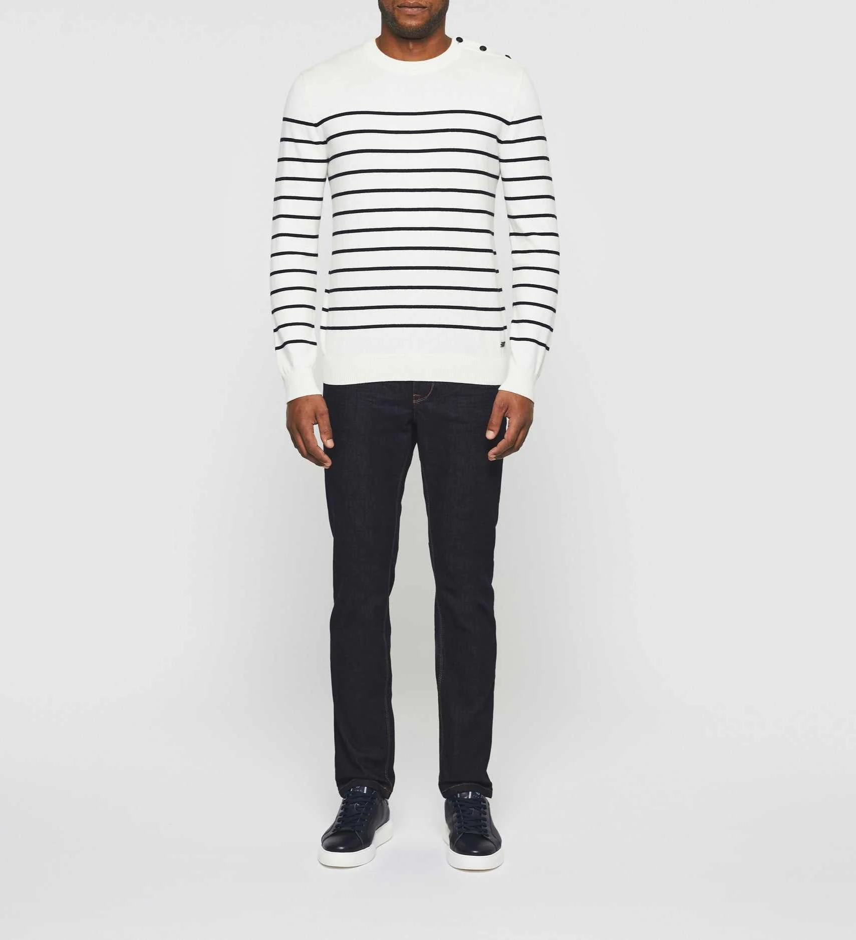 Pull marin revisité cette saison avec un nouveau style de rayures.