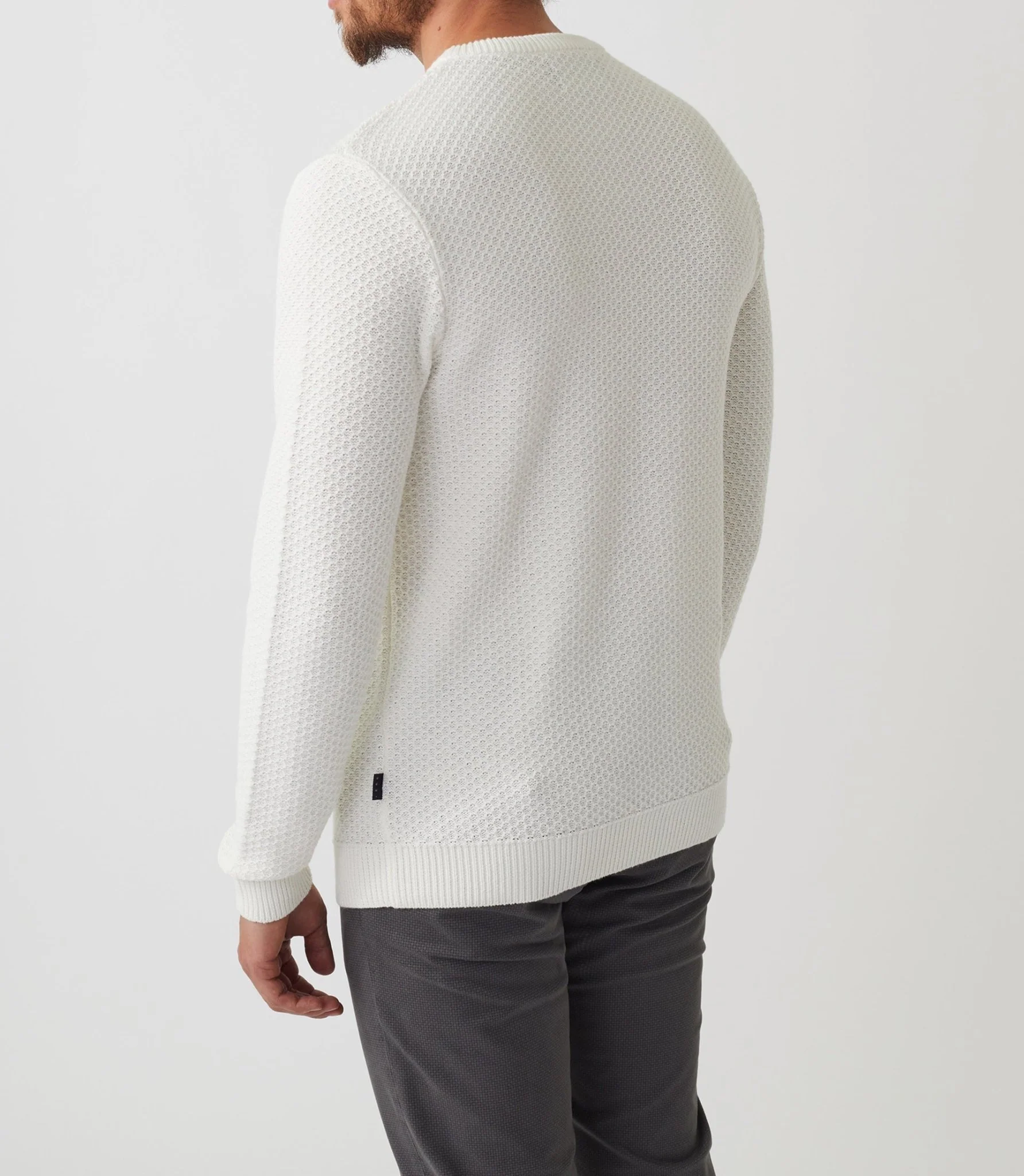 Il est réalisé dans un jeu de points fantaisie qui revisite le traditionnel nid d’abeille.