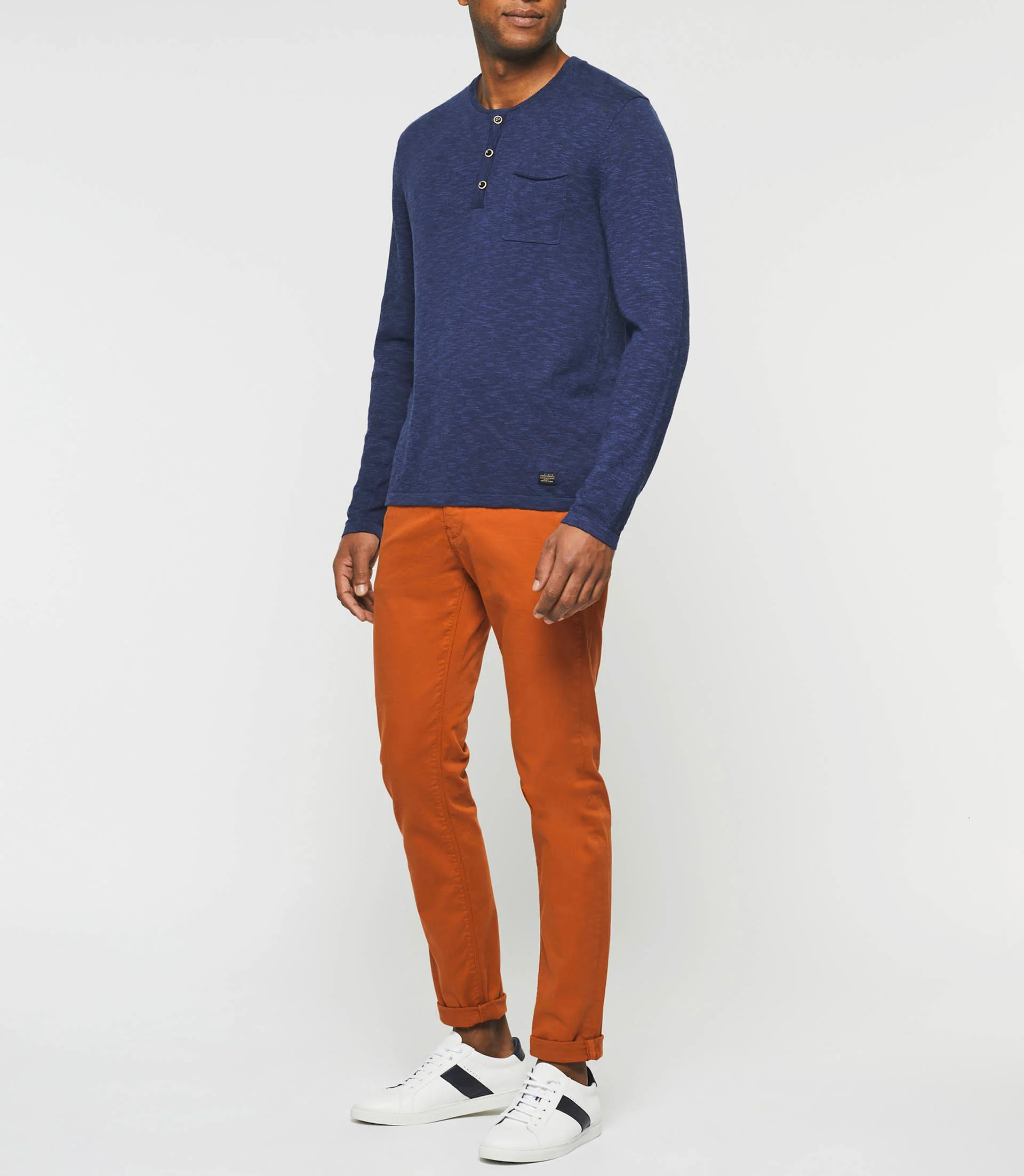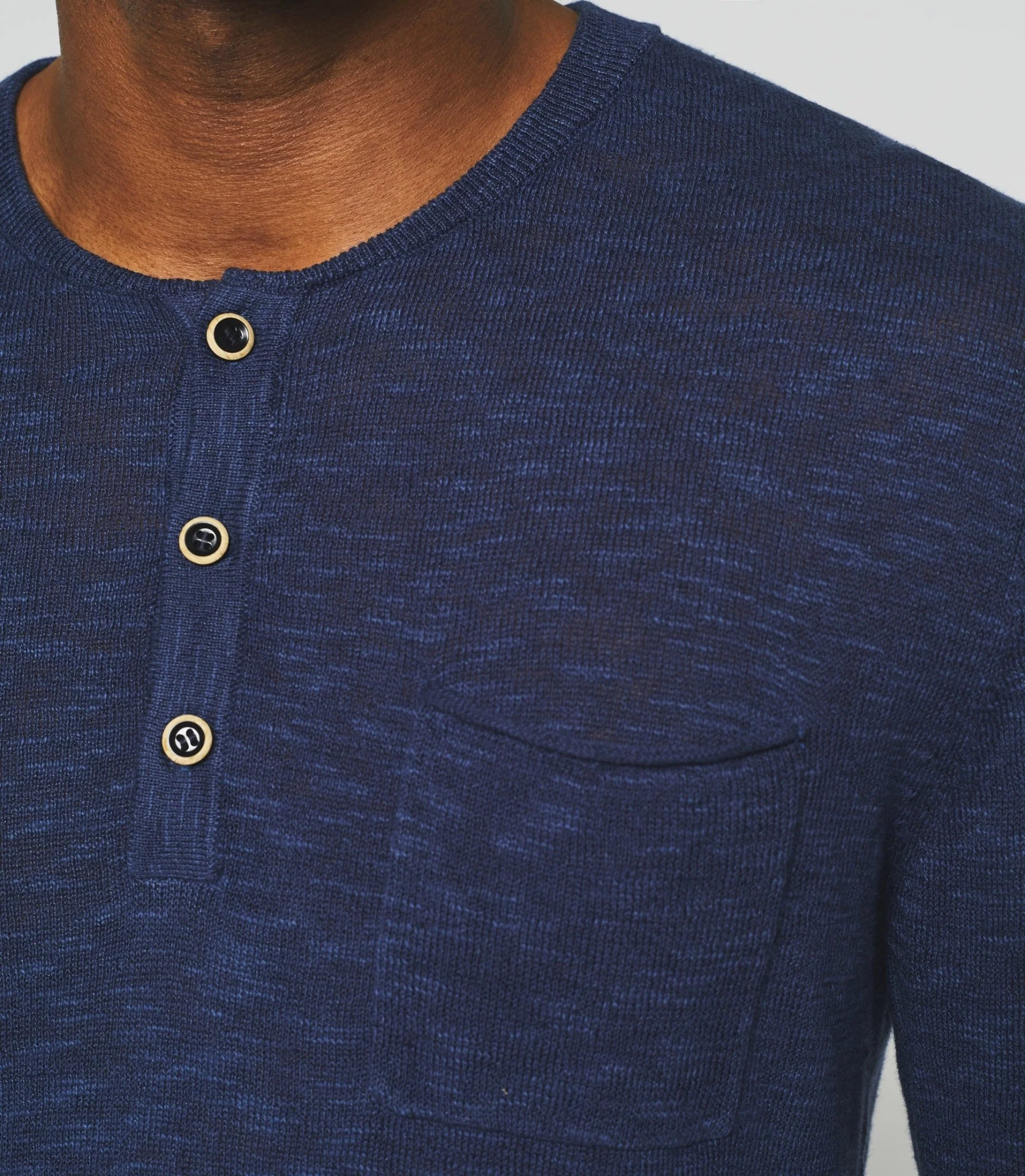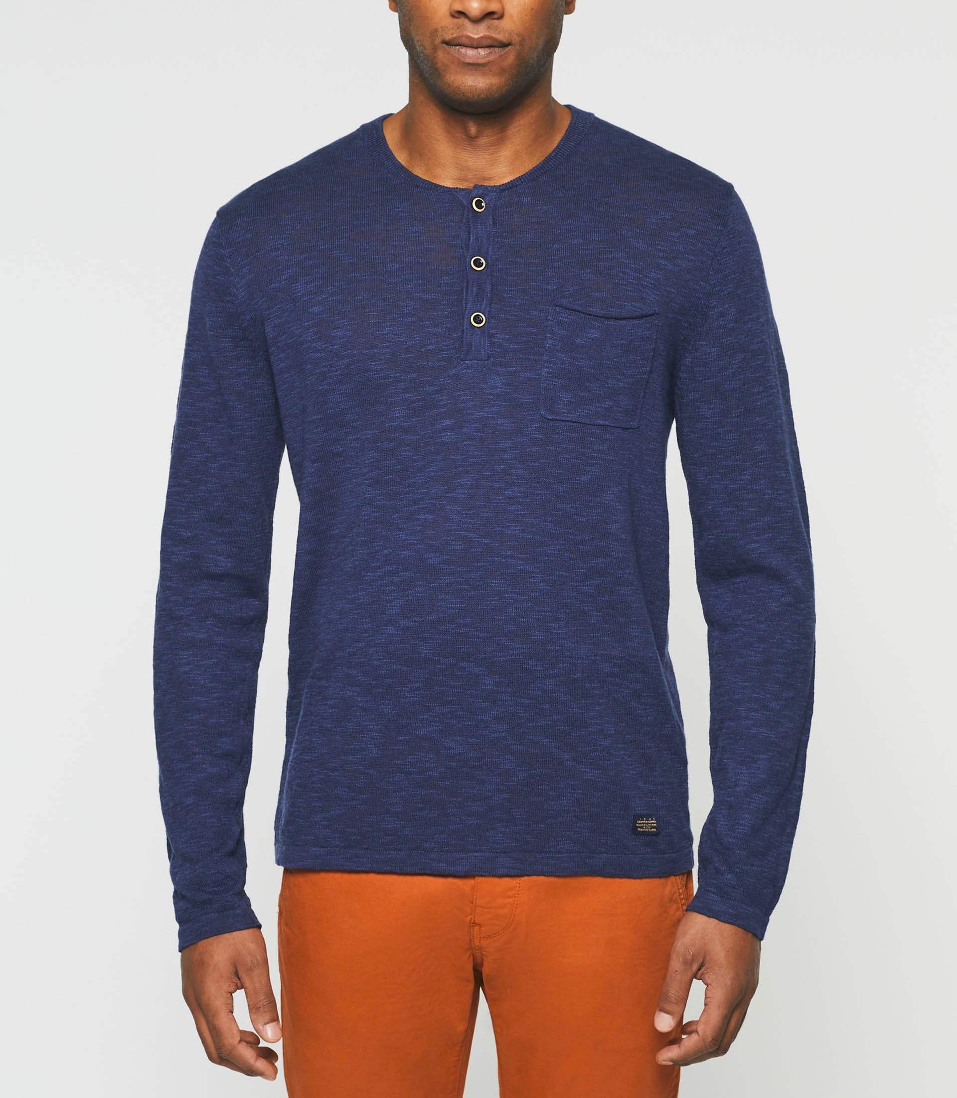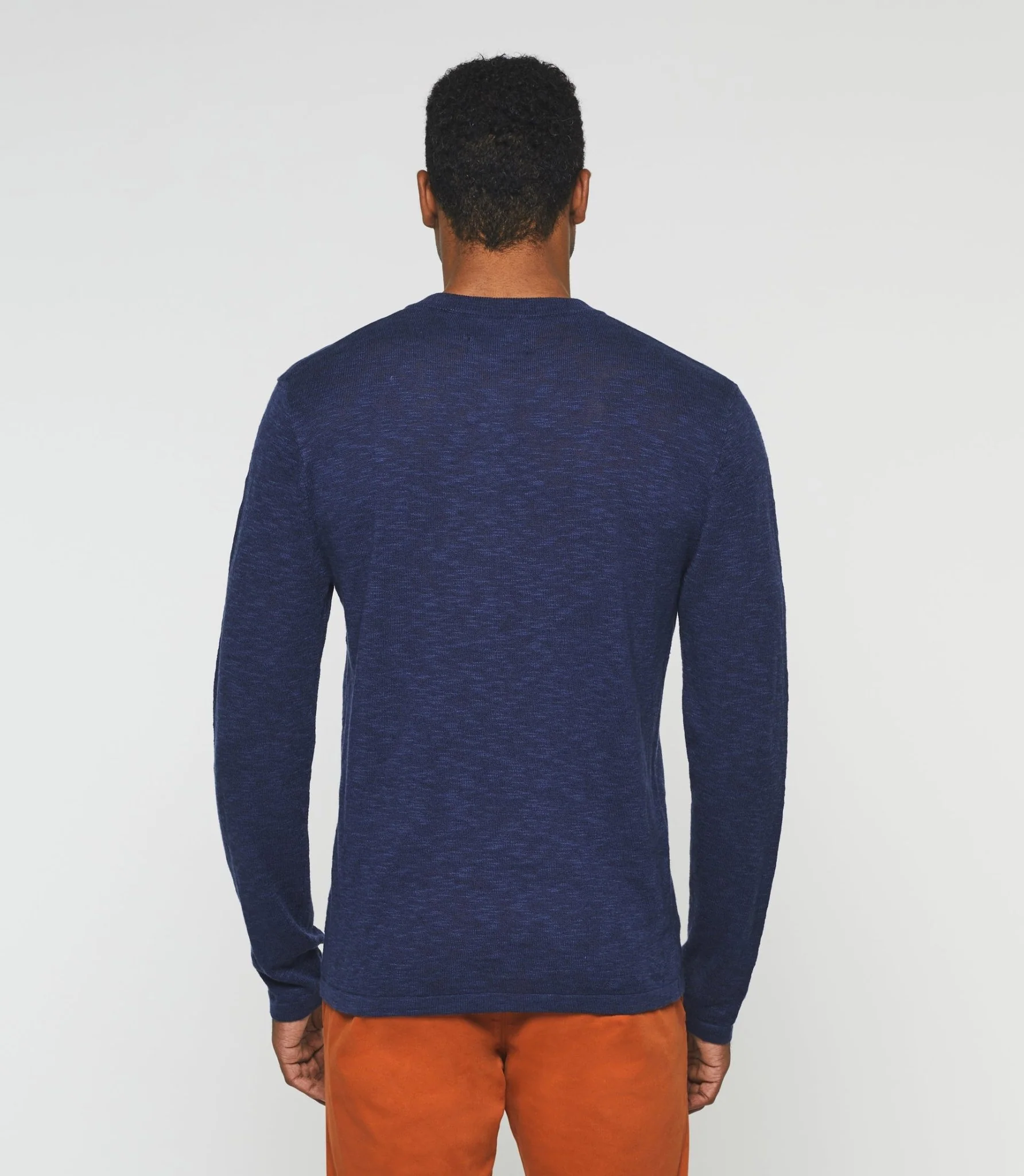 Ce pull col rond avec patte de boutonnage est réalisé dans un mix de matière lin et coton.